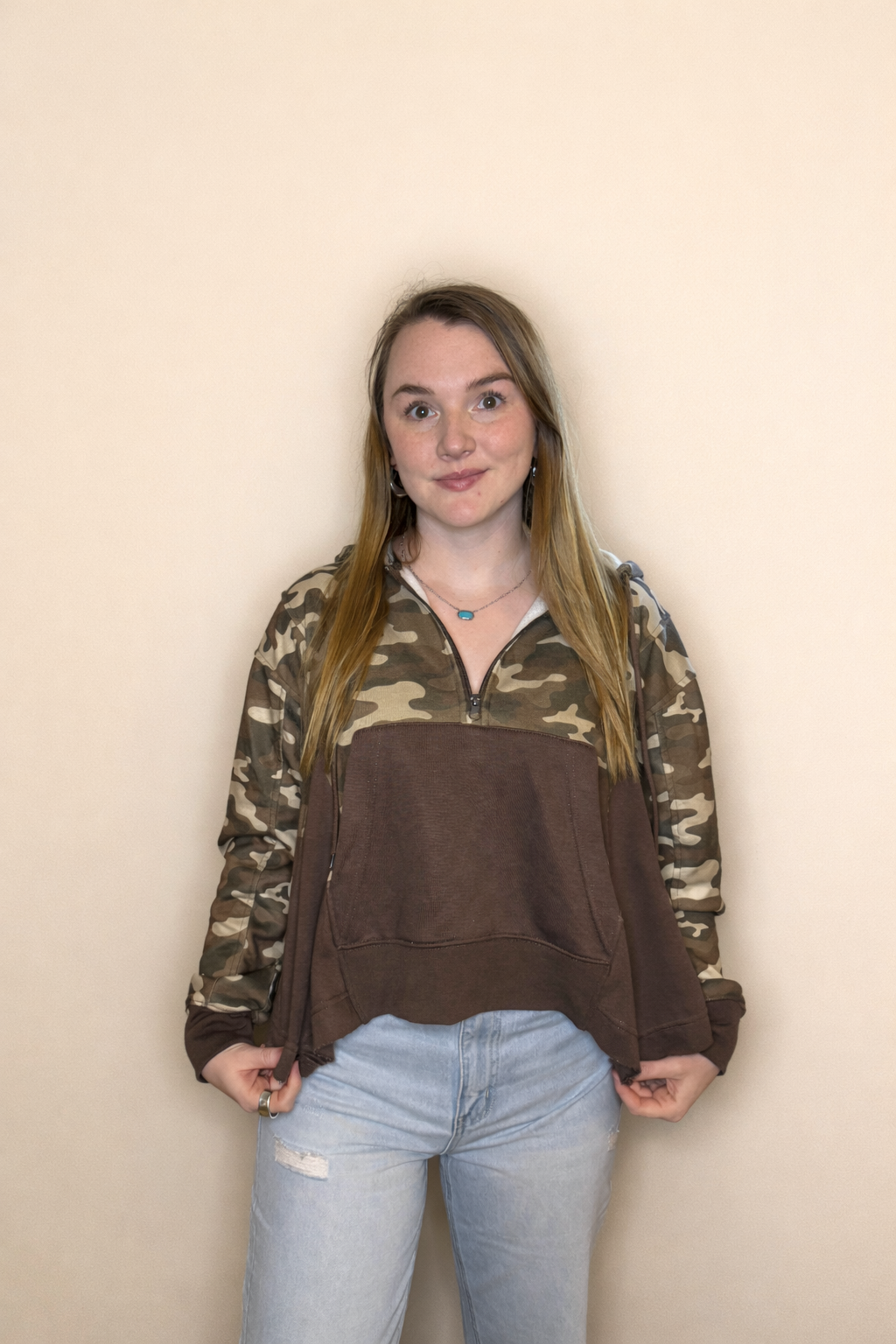 This half-zip hoodie pullover features a relaxed, swing-style fit. With a super soft texture, roomy hood, kangaroo pockets, and an easy half-zip neckline, it’s the perfect throw-on layer for effortless everyday style.
